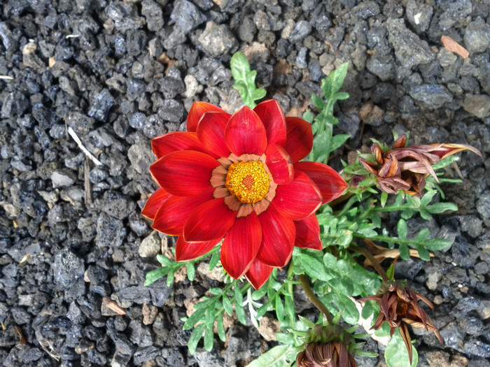Prapadita asta de cala a fost aruncata acolo. Am avut mai multi bulbi intr-un ghiveci mare si nu au vrut sa infloreasca, nici frunze nu au facut, macar. M-am suparat si am aruncat pamintul ce a fost in ghiveci, in gradinuta.Acum citeva zile, din intimplare trecind pe acolo am vazut frunzele, ca ieri sa fac o inspectie si sa vad floarea...Acum ma gindesc ce s-o fi intimplat cu ceilalti bulbi....:))